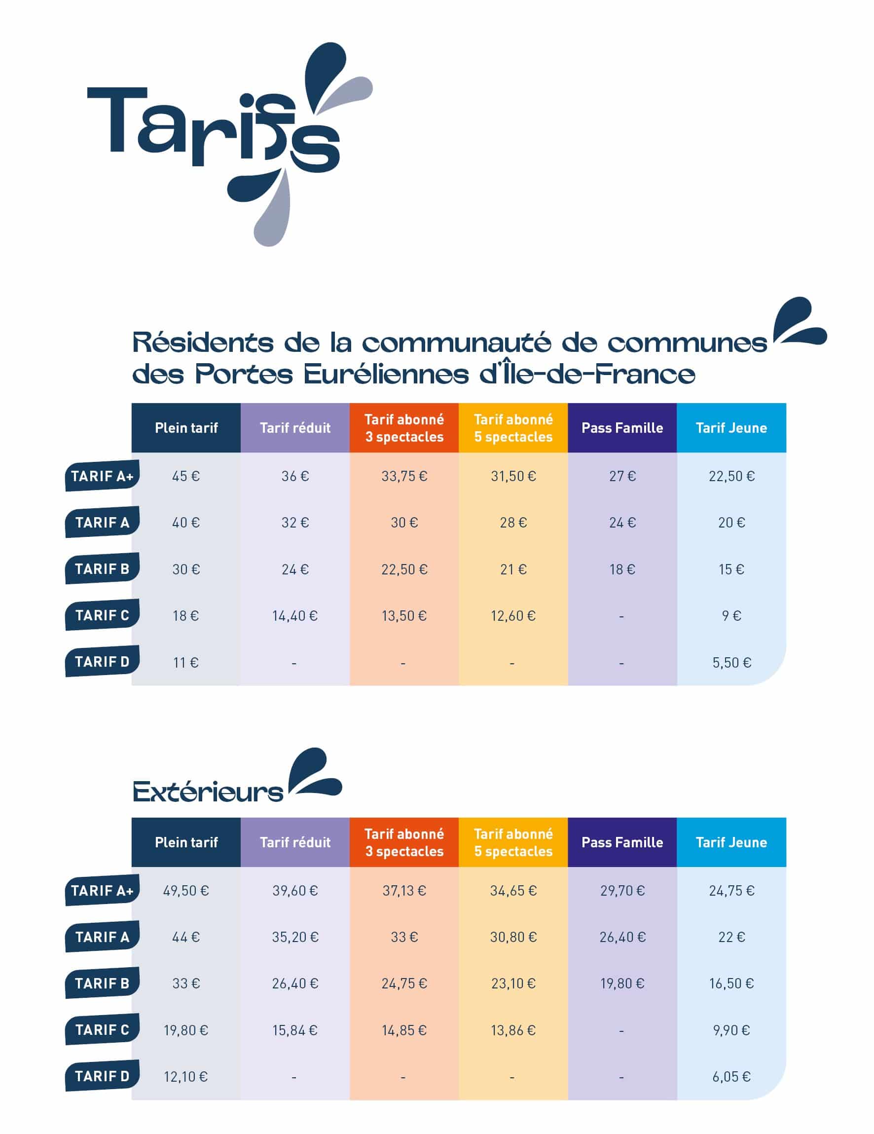 - Carnet 10 places : 46 € (pour les habitants de la communauté de commune des Portes Euréliennes d’Île-de-France sur présentation d’un justificatif de domicile) ou 48 € (pour les extérieurs)